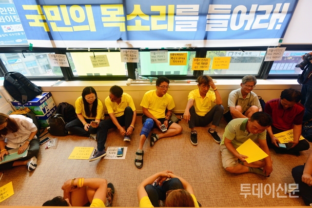 【투데이신문 전소영 기자】세월호 유가족들과 백남기대책위원회는 25일 세월호 특별법 개정과 백남기 농민 사건 청문회 개최를 요구하며 더불어민주당 당사를 점거했다. 이에 더민주는 대응책 마련에 나섰다.