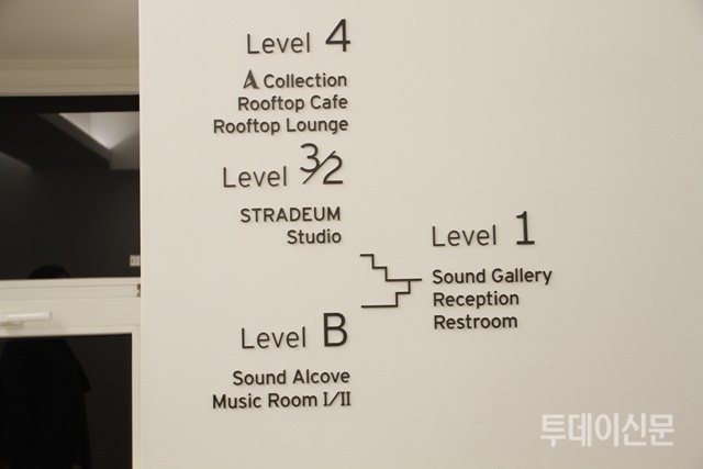 스트라디움에서는 다채로운 방식으로 음악을 즐길 수 있습니다. 입구(Level 1)에 들어서면 음악을 눈으로 보고 직관적으로 느끼며 집중적으로 즐길 수 있도록 구성한 사운드 갤러리가 있고, 최고의 어쿠스틱을 갖춘 스트라디움 스튜디오(Level 2), 최적의 음악 감상 공간 뮤직룸(Level B), 커피와 차를 마시며 음악을 들을 수 있는 루프탑 라운지(Level 4) 등 다양한 형태의 공간에서 음악을 감상할 수 있습니다. 한 곳씩 천천히 둘러보도록 하죠.