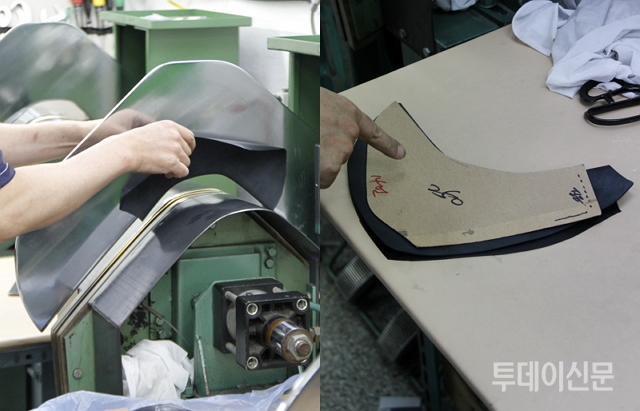 전씨가 가죽을 깎는 동안 가게 한 편에서는 신발에 일정한 굴곡과 각도를 만들어주는 ‘하리’ 작업을 구경할 수 있었다. 평평했던 가죽을 틀 사이에 넣고 고열로 눌러주자 일정한 굴곡이 생겨 밀려 올라왔다. “우와” 감탄사를 연발하며 신기해하는 기자에게 주인 김씨는 일일이 가게 안을 돌며 각기 다른 하리틀을 설명해주는 친절함까지 보였다.