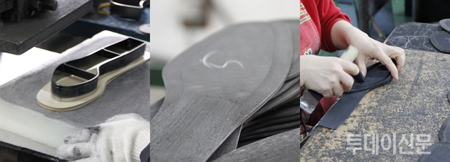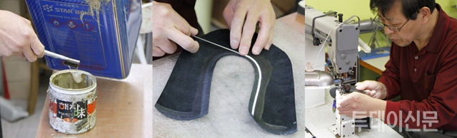 조씨는 제화풀을 바른 가죽 위에 하얀 끈을 둘러 붙였다. 하얀 끈의 정체에 대해 궁금한 눈빛을 보내는 기자에게 조씨는 아무 말없이 끈을 잘라 건네더니 손으로 당겨서 끊으면 신발 한켤레는 만들어 주겠다고 했다. 들고 있던 카메라까지 잠시 내려두고 젖 먹던 힘까지 다해 양손으로 줄을 당겼다. 하지만 끊어지기는 고사하고 손만 벌겋게 달아올랐다. “안끊어지는거 알고 일부러 그러신 거죠”라는 원망 섞인 기자의 말에 조씨는 “테이프라고 부르는데 목실로 만들어 졌다”며 “이걸 붙이지 않으면 아무리 튼튼한 가죽이라 할지라도 신발모양을 오래 유지하지 못하고 금방 터져버린다”는 설명으로 답을 대신했다. 재봉틀로 자리를 옮긴 조씨는 가죽 색에 맞춰 실색을 고른 후 ‘드르륵, 드르륵’ 소리와 함께 한 치의 망설임도 없이 가죽들을 연결했다. 조각나있던 가죽들을 연결하자 제법 신발의 모습을 갖췄다.