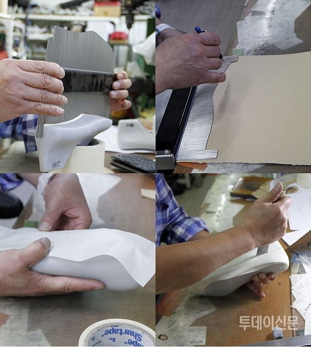 책상 앞에 앉은 전씨는 주문에 맞는 라스트를 고르고 가장 먼저 발바닥 부분의 패턴을 떴다. 발바닥 굴곡에 맞춰 모양을 잡은 참빗을 그대로 갈색 패턴지 위에 올려 따라 그렸다. 그리고는 모양에 맞게 패턴 뜨는 용으로 제작된 칼을 이용해 선을 따라 패턴지를 오렸다.