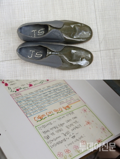 | ▲ 제자가 전태수 장인에게 선물한 구두(상), 제자가 쓴 손편지(하) ⓒ투데이신문 | ||