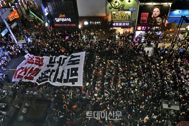 | ▲ 지난 19일 대구 중구 대중교통 전용지구에서 열린 박근혜 대통령의 퇴진을 촉구하는 제3차 대구 시국 대회 ⓒ뉴시스 | ||