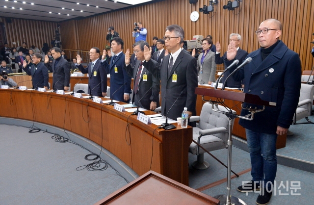 | ▲ 제2차 청문회에 자리한 증인들이 증인선서를 하고 있다. ⓒ뉴시스 | ||