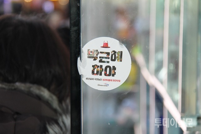 | ▲ 서울역에 '박근혜 하야' 스티커가 붙어있다 ⓒ투데이신문 김민수 인턴기자 | ||