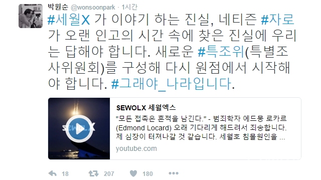 박 시장은 자신의 트위터를 통해 “세월호X가 이야기 하는 진실, 네티즌 자로가 오랜 인고의 시간 속에 찾은 진실에 우리는 답해야 합니다”라고 말했다.
