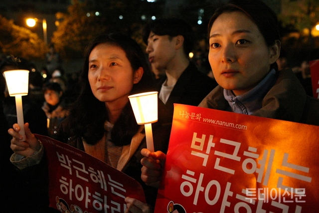 10월 29일 서울 광화문광장에서 1차 촛불집회가 열렸다. 박근혜 대통령이 1차 대국민담화를 발표하고 사흘 뒤였다. ‘최순실 게이트’에 분노한 시민들은 저마다 민주주의의 회복을 외치며 광장에 모였다. 주최측 추산인원 2만명이 모인 이날을 시작으로 매주 토요일 전국적으로 시민들이 불어났고, 전국 각지에서 집회를 위해 상경하는 진풍경도 벌어졌다. 1~9차 촛불집회까지 주최측이 추산한 전국 누적인원은 총 907만명으로 역대 최다인원이다. 폭력이나 쓰레기 없는 평화 시위가 성숙한 시민의식을 보여줬다는 점에서 여러 외신들의 주목을 받기도 했다.