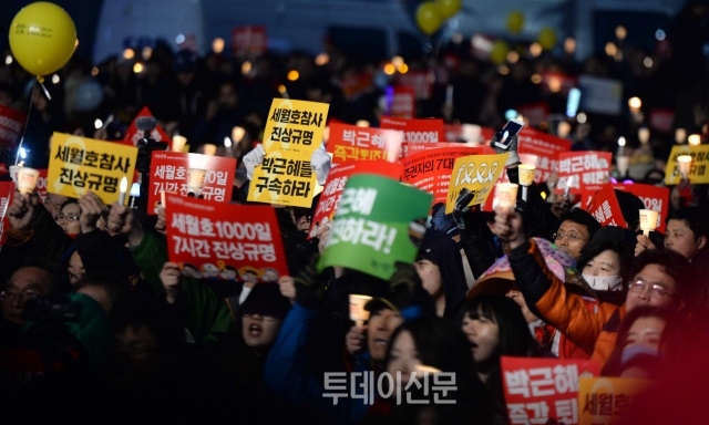 ‘박근혜정권퇴진 비상국민행동’(이하 퇴진행동)은 이날 광화문 광장에서 ‘박근혜는 내려오고 세월호는 올라오라’는 제목으로 세월호 유가족들과 함께 촛불집회를 열었다.
