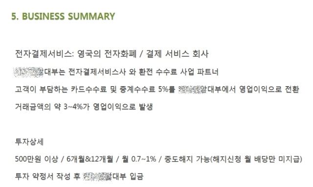 K대부의 경우 영국의 유명 전자화폐결제 서비스 회사 N사와 환전수수료 사업파트너를 맺었다고 소개했다. 고객이 부담하는 카드수수료 및 중계수수료 5%를 K대부에서 영업이익으로 전환해 거래금액의 약 3~4%의 영업이익이 발생하는 구조라고 설명했다. 6개월에서 12개월까지 500만원 이상 투자가 가능하며 월 0.7~1%의 수익이 발생한다고 했다.