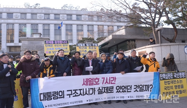 | ▲ 지난 11일 서울 헌법재판소 앞에서 세월호 유가족들과 퇴진행동 회원들이 박 대통령의 ‘세월호 7시간’ 헌재 답변서를 비판하는 기자회견을 열고 있다. ⓒ뉴시스 | ||