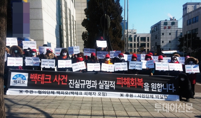 백테크 피해자 모임(백피모)는 25일 오전 서울 서초동 서울중앙지방법원 앞에서 50여명의 회원들이 참석한 가운데 ‘백테크 사건 진실규명과 실질적 피해회복을 위한 집회’를 열었다.