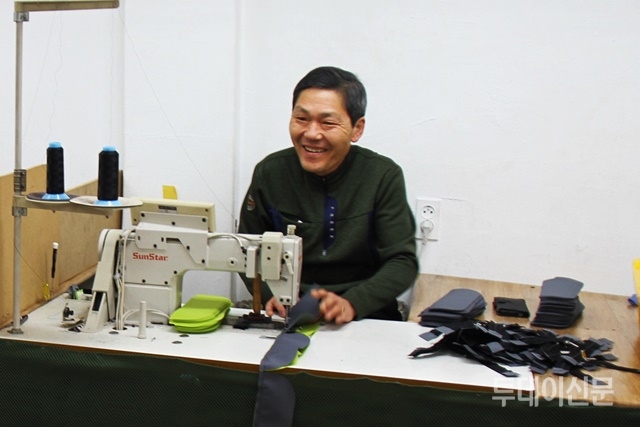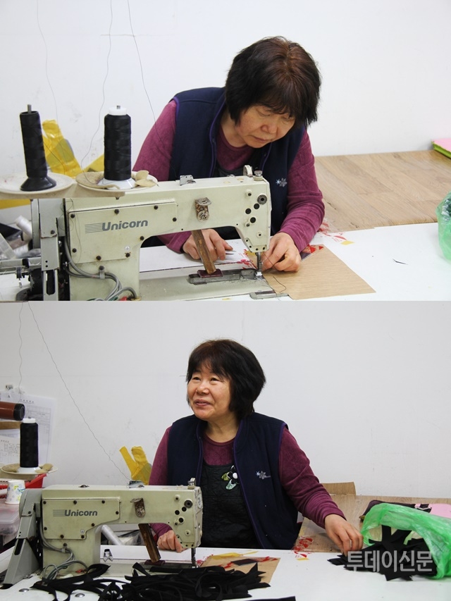 가방 앞주머니의 마찌(천 부품 연결) 작업을 하고 있던 박옥미씨는 5년 전 언니와 형부를 따라 일을 시작했다. 그는 “다른 분들 얘기 들어보면 엄청 힘들게 배운다고 하던데, 저는 식구들이 잘 가르쳐줘서 비교적 편하게 배운 것 같네요”라며 활짝 웃었다.
