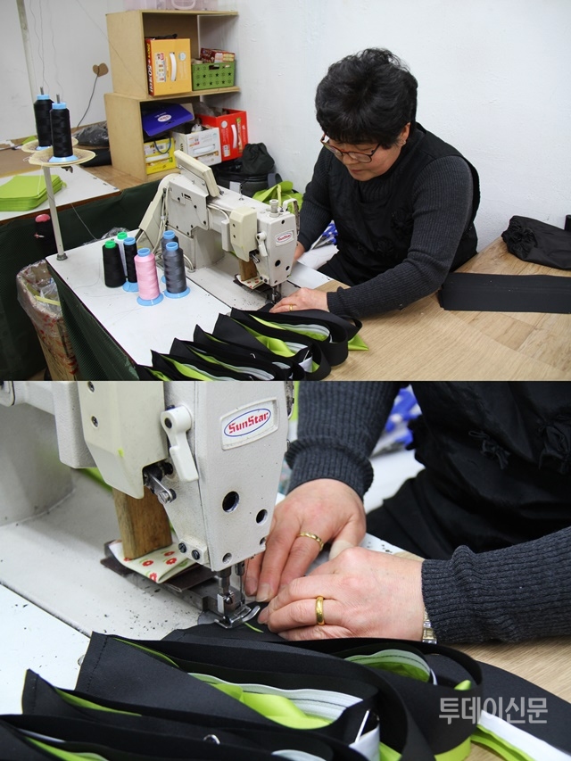 박순옥씨는 말없이 재봉틀에 조기대를 받쳤다. 조기대는 재봉틀의 바늘이 이리저리 움직이지 않도록 고정시켜주는 역할을 한다. 준비를 끝낸 그는 본격적으로 배낭 손잡이 부분의 박음질을 시작했다.