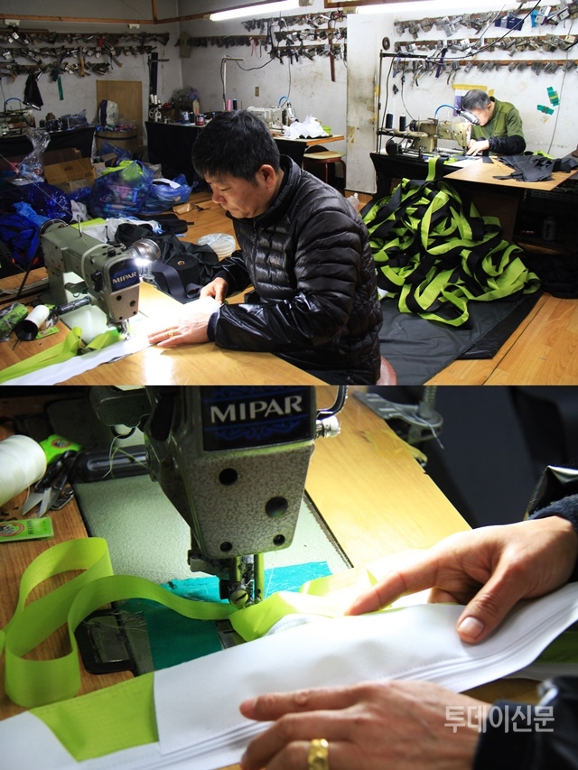 장 과장과 이런저런 이야기를 하며 신월동 골목을 걷다 보니 어느 건물 지하 1층에 위치한 ‘승민산업’에 다다랐다. 가파른 계단을 하나둘 내려가자니 멀리서부터 재봉틀 소리가 들려왔다. 문을 열자 이미 4명의 사람들이 재봉틀 앞에서 씨름하고 있었다. 무표정으로 작업에 열중하던 그들은 기자를 보더니 금세 미소를 지으며 반갑게 맞아줬다.