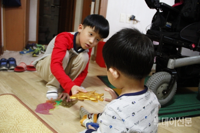 아빠에게 “다녀왔습니다”라는 짧은 인사를 마친 하람이는 홀로 딱지를 치며 놀았다. 아빠 규정씨는 홀로 노는 아들의 모습을 볼 때면 마음 한구석이 불편하다. 아빠와 아들은 함께 뛰놀며 몸을 부딪쳐야 정이 쌓인다는데 규정씨는 그럴 수 없어 미안할 따름이다. 종종 자원봉사자의 남편이 찾아올 때 안기며 놀아달라고 보채는 하늘이를 보면 아빠의 미안함은 배가 된다.