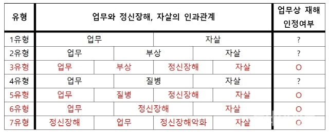 이달휴 교수는 업무상 자살의 종류를 위의 표와 같이 구분했다. 상기 유형 중 법령상의 규정에 따라 정신장해로 인한 자살인 3, 5, 6, 7유형은 명확하게 업무상 자살로 인정할 수 있다고 전했다.