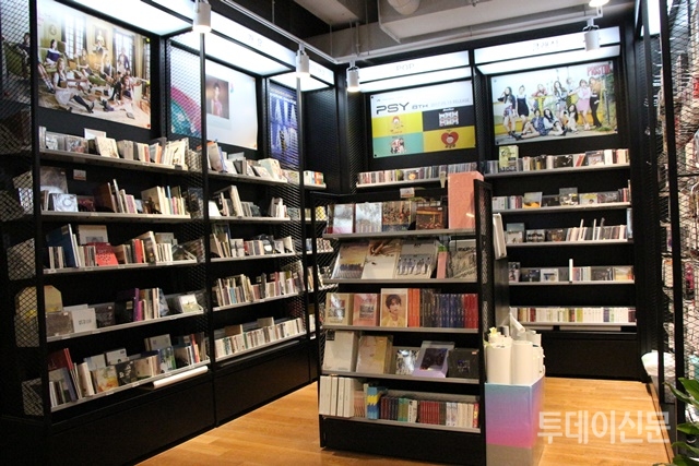 책 냄새 가득한 벽을 따라 가다보면 카페와 책꽂이 사이 음반코너가 자리하고 있습니다. 음반 코너의 규모가 크지는 않지만 꾸준히 사랑받는 음반과 시중에 인기를 끌고 있는 K-pop 음반이 많이 있어 천천히 둘러보시면 취향에 맞는 좋은 음반을 찾을 수 있을 것 같네요. 그 옆에는 헤드폰, 이어폰과 같은 제품도 자리하고 있더군요.