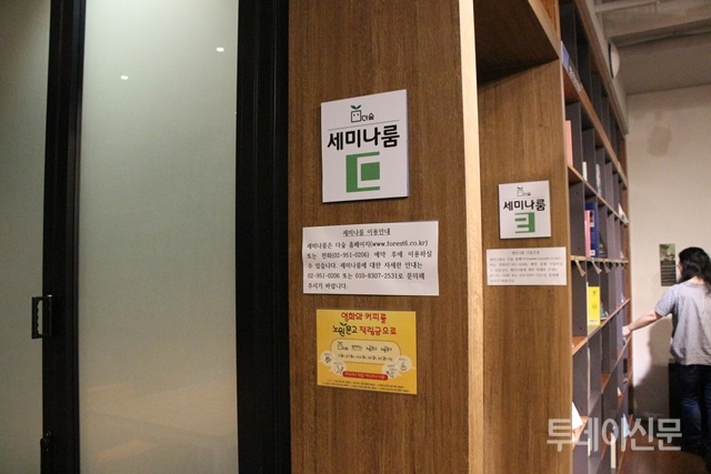 적게는 6명, 많게는 20명까지 수용 가능한 세미나실에는 프로젝터와 칠판 등의 편의시설이 있어 스터디나 세미나를 하기 위해 이곳을 찾는 사람들이 많다고 하네요. 좋은 뜻으로 만든 공간인 만큼 시간당 따로 돈은 받지는 않지만 인원수대로 음료를 주문해야 이용할 수 있고, 이용하고 싶어 하는 분들이 많기에 시간제한을 2시간으로 두고 있다고 합니다.