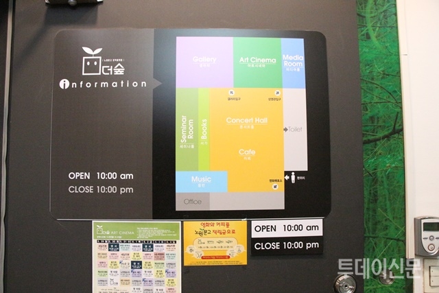 200평 규모의 더숲은 지역주민을 위한 복합문화공간으로서 “더불어 함께 숲을 만들어나간다”는 뜻을 가지고 있다고 합니다. 이곳은 영화관, 갤러리, 카페, 서점과 음반매장, 콘서트홀, 미디어룸, 세미나룸 등 7개 파트로 구성돼 있습니다.