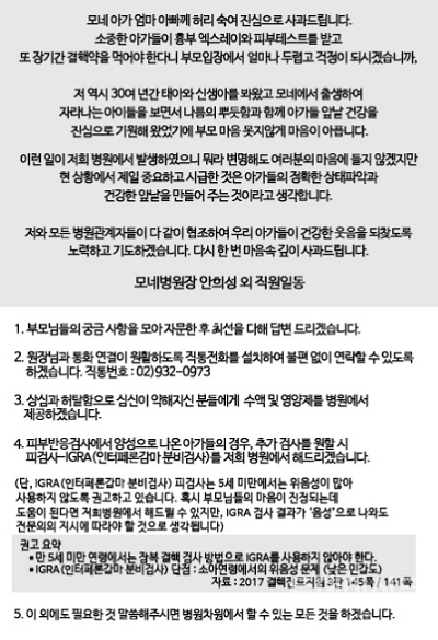 이어 “결핵은 100년 가까이 사라지지 않고 있는 질병인데다 특히 피해자가 신생아들이기 때문에 부모들 입장에서는 답답할 노릇”이라며 “지속적인 관리가 필요한 질병인데 병원에서는 할 수 있는 게 없다는 말만 반복하고 있다. 방법이 없다고 할지라도 병원 측에서 먼저 설명회나 공청회를 열어 부모들과 직접 대화에 나서서 진정성 있는 모습을 보여줘야 한다”고 강조했다.