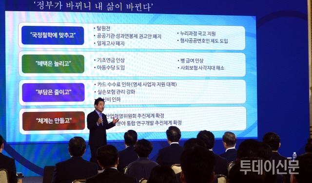 또한 100대 국정과제와는 별도로 새정부의 국정비전을 선명하게 부각할 수 있는 4대 복합·혁신과제로 △불평등 완화와 소득 주도 성장을 위한 일자리 경제 △4차 산업혁명을 선도하는 혁신 창업국가 △교육·노동·복지체계 혁신으로 인구절벽 해소 △국가의 고른 발전을 위한 자치분권과 균형발전 등도 제시됐다.