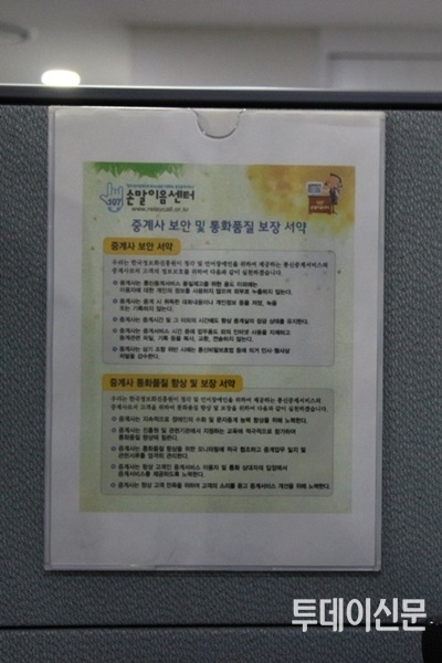 녹음이나 통화내역 등 기록을 남기지 않는 이유에 대해 신 중계사는 “통신중계의 특성상 이용자의 주민등록번호나 계좌 비밀번호 등 개인정보를 중계사에게 말해야하는 경우가 있어서 개인정보 유출을 막기 위해 남기지 않는 거죠”라고 말했다. 서비스를 이용하는 장애인들 중 개인정보 유출을 불안해하는 분들은 없는지 물었더니 그는 “중계사들은 개인정보보호를 위해서 ‘통신중계서약’을 해요. 어길 경우엔 처벌을 받을 수도 있어요”라고 설명했다. 실제로 중계사의 자리마다 통신중계서약이 붙어있었다.