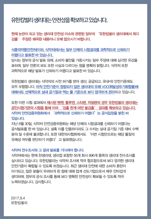 이어 “현재 식약처에서는 천 생리대와 생리컵 등 56개 회사 896개 품목의 생리대 전수조사를 하고 있다. 유한킴벌리는 식약처 조사에 적극 협조함으로써 보다 엄격한 생리대 안전기준이 확립될 수 있도록 하겠다”라고 말했다.