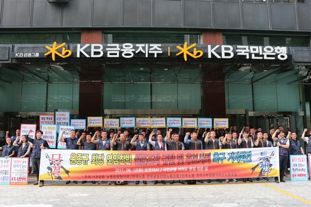 노조는 지난 13일 직원 설문조사 결과를 조작한 KB금융지주 윤종규 회장을 업무방해죄 및 부당노동행위 혐의로 영등포경찰서에 고발했다.