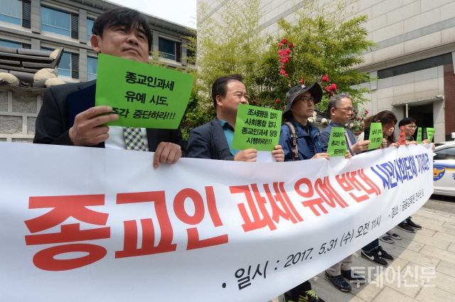 반면 한국납세자연맹 등 시민단체는 지난 8월 24일 ‘종교인 과세 유예 법안 발의 국회의원 사퇴 요구 시민사회단체 기자회견’을 열고 “보수 개신교계를 제외하면 언론과 시민사회가 한목소리로 종교인 과세 시행을 요구하고 있다”고 강조했다.