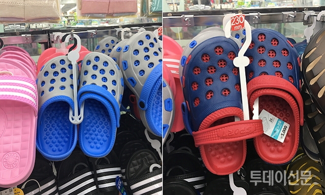 저가 생활용품 브랜드에서 업계 1위를 차지하고 있는 다이소의 경우에는 한국에서 높은 인기를 구가하고 있는 해외 유명 신발 브랜드 크록스의 ‘클로그’가 연상되는 신발을 잡화 판매대 한편에서 판매하고 있었다.
