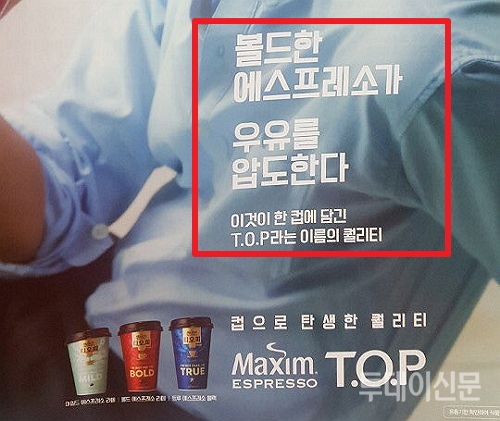 배우 원빈을 모델로 기용한 음료 제조업체 동서식품의 커피 브랜드 맥심 ‘T.O.P(티오피)’ 광고 문구다. 한글로 표기된 이 홍보 문구를 원래의 영어 단어로 표기하면 ‘Bold(볼드)한 Espresso(에스프레소)가 우유를 압도한다. Cup(컵)으로 탄생한 퀄리티(Quality)’가 된다.
