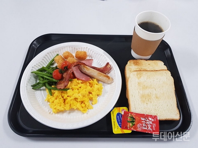 사진에는 일회용 접시 위에 식빵 2장과 스크램블 에크, 베이컨 3장이 올려져 있으며, 우측에 일회용 나이프와 포크가 놓여 있었다. 그리고 왼쪽 상단에는 오렌지 주스 1병이 놓여있다.