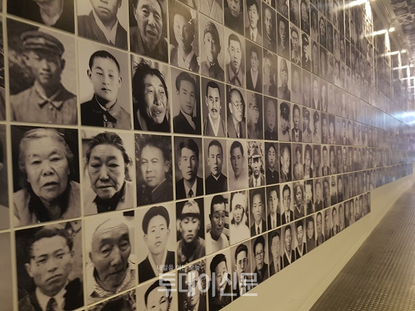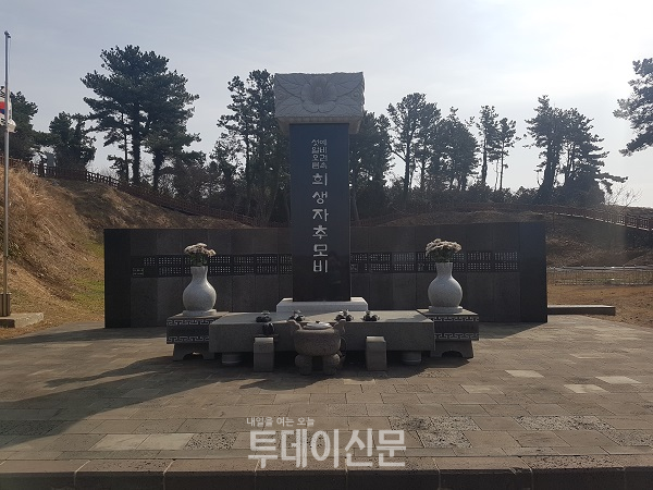 바람과 햇살이 함께 나뒹구는 옛 활주로 터를 따라 예비검속자들이 집단 학살된 처절한 현장으로 발길을 옮겼다. 누군가 추모비 앞에 두고 간 검정고무신 두 켤레가 가슴을 먹먹하게 쓸어내린다. 준비 없이 맞이한 죽음 앞에 공포에 떠는 눈빛으로 서있는 열일곱 소년의 맨발이 오버랩 된다. 총을 겨눈 이도, 꽃다운 나이를 탄약고 터에 묻어버린 맨발의 소년도, 그저 동네 아저씨요 이웃집 아이였을 그들의 슬픈 눈빛이 진녹색 웅덩이에 박혀있다.