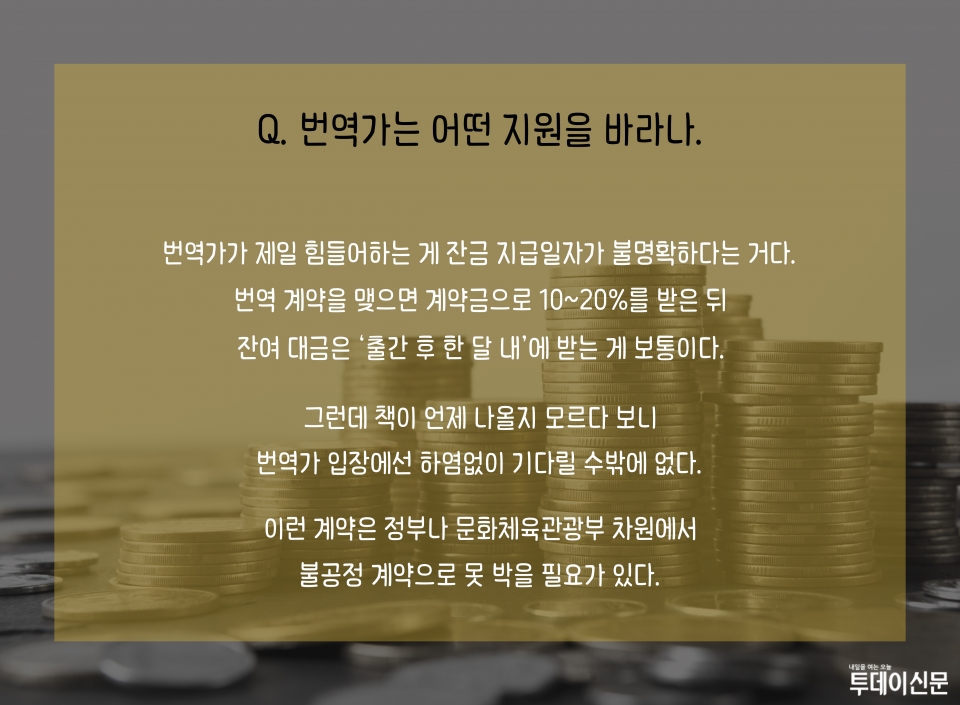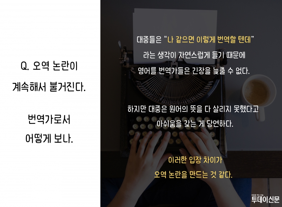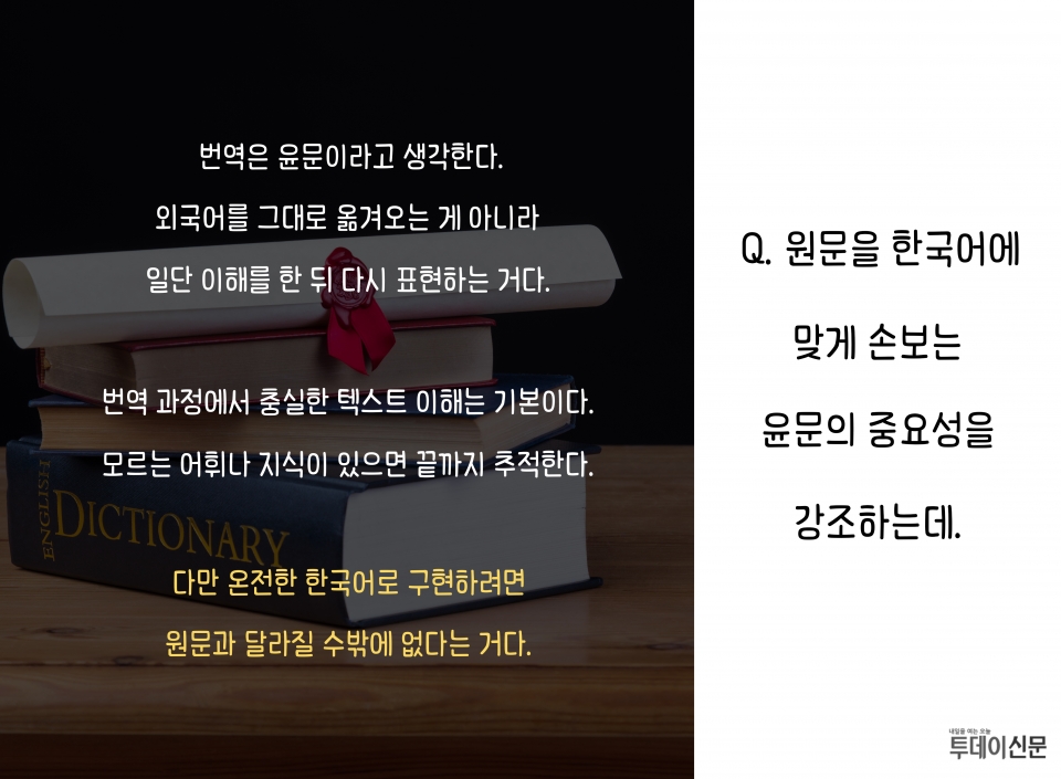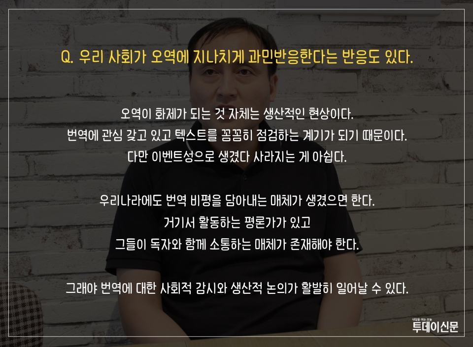 관련기사 [더 나은 번역을 위하여③] 김택규 번역가 “오역 논란, 생산적 논의 기회로 만들 수 있어” [더 나은 번역을 위하여②] “번역은 지식산업의 근간”…정부 지원 확대 필요성 제기돼 [더 나은 번역을 위하여①] 계속되는 오역 논란, 원인과 해법은?