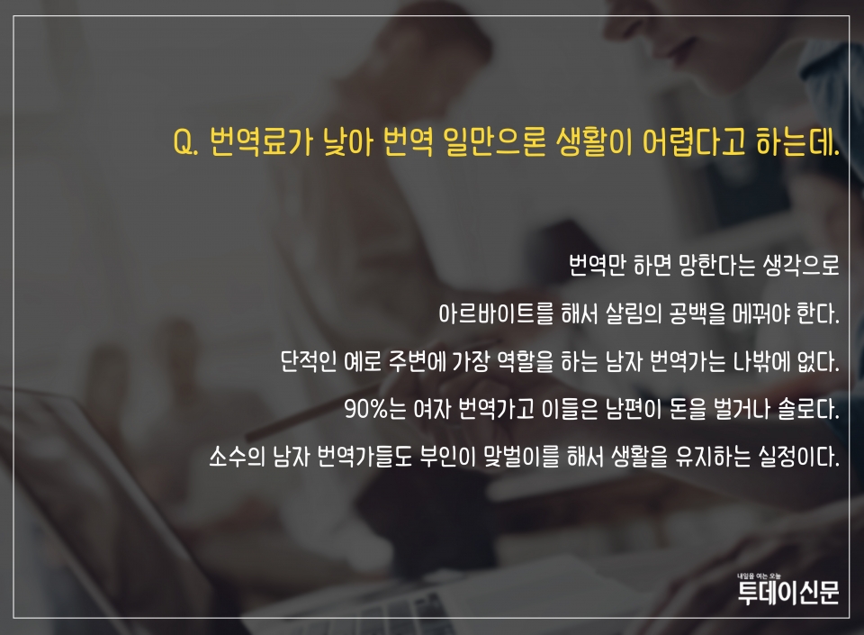 관련기사 [더 나은 번역을 위하여③] 김택규 번역가 “오역 논란, 생산적 논의 기회로 만들 수 있어” [더 나은 번역을 위하여②] “번역은 지식산업의 근간”…정부 지원 확대 필요성 제기돼 [더 나은 번역을 위하여①] 계속되는 오역 논란, 원인과 해법은? 키워드 #번역 #번역가 키워드 #투데이신문 #청년 #심층취재 #인터넷신문 #심층기획 김도양 기자 todaynews@ntoday.co.kr 다른기사 보기 저작권자 © 투데이신문 무단전재 및 재배포 금지 인기기사 [포토] 제4기 투데이신문 청년플러스 서포터즈 해단식 성황리에 마쳐 ‘제4기 청플 서포터즈’ 해단식 성료…박애경 대표 “청년과 동행 계속될 것” 권신영 기자 격론장 오른 새벽배송 제한, 현실화할까 강현민 기자 삼성카드 없는 삼성카드…삼성전자 새 카드 전략 어디로 김효인 기자 [칼럼] AI 시대의 부정행위: 시험, 욕망, 그리고 사회의 구조 이종우 칼럼니스트 GS건설 허윤홍 체제 2년, 단독 경영 기로에 서다 심희수 기자 최신기사 카카오헬스케어 품은 차바이오텍…차원태, 두 달 만에 첫 존재감 캠코, 동반성장 유공 ‘중소벤처기업부 장관 표창’ 수상 문영서 기자 11월 기업경기, 반도체가 견인…13개월 래 최고 문영서 기자 삼성바이오로직스, 규제기관 제조 승인 400건 달성 강현민 기자 LG생활건강, 사과나무의료재단과 ‘구강 마이크로바이옴’ 연구 협력 강현민 기자 [인사] 삼성화재 투데이신문 개의 댓글 회원로그인 댓글 내용입력 댓글 정렬 최신순 추천순 답글순 BEST댓글 BEST 댓글 답글과 추천수를 합산하여 자동으로 노출됩니다. 닫기 더보기 댓글삭제 삭제한 댓글은 다시 복구할 수 없습니다. 그래도 삭제하시겠습니까? 비밀번호 닫기 댓글수정 댓글 수정은 작성 후 1분내에만 가능합니다. 본문 / 400 비밀번호 닫기 내 댓글 모음 닫기
