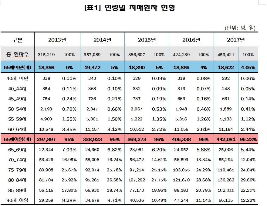 심평원에 따르면 2017년 기준 전체 치매환자 수 45만9421명 가운데, 65세 미만의 환자 수는 1만8622명으로 전체 치매환자의 약 4%를 차지하는 것으로 조사됐다.
