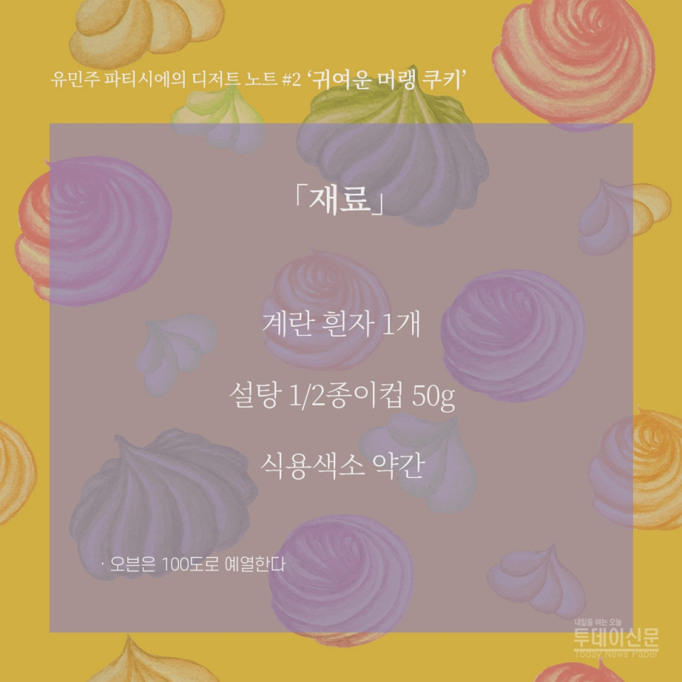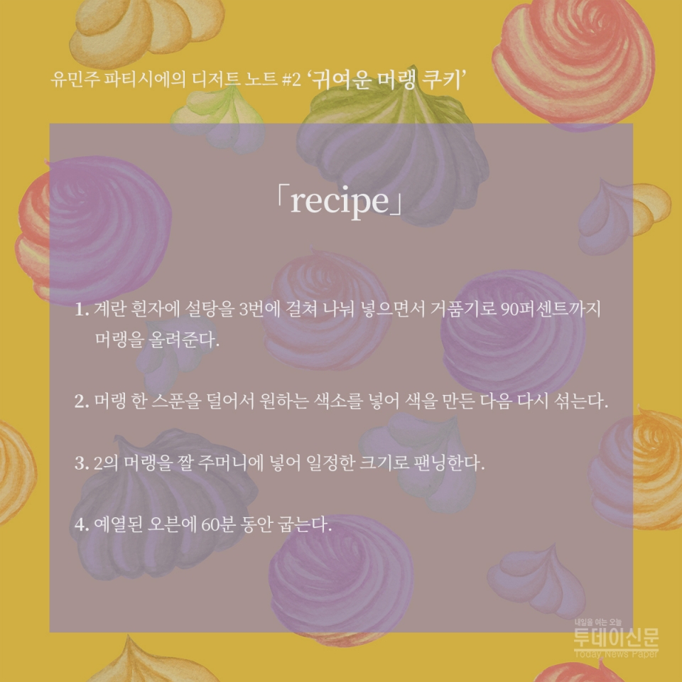 키워드 #유민주 파티시에 #디저트 노트 #귀여운 머랭쿠키 키워드 #투데이신문 #청년 #심층취재 #인터넷신문 #심층기획 양지은 인턴기자 todaynews@ntoday.co.kr 다른기사 보기 저작권자 © 투데이신문 무단전재 및 재배포 금지 인기기사 [포토] 제4기 투데이신문 청년플러스 서포터즈 해단식 성황리에 마쳐 ‘제4기 청플 서포터즈’ 해단식 성료…박애경 대표 “청년과 동행 계속될 것” 권신영 기자 격론장 오른 새벽배송 제한, 현실화할까 강현민 기자 삼성카드 없는 삼성카드…삼성전자 새 카드 전략 어디로 김효인 기자 GS건설 허윤홍 체제 2년, 단독 경영 기로에 서다 심희수 기자 [칼럼] AI 시대의 부정행위: 시험, 욕망, 그리고 사회의 구조 이종우 칼럼니스트 최신기사 알스퀘어, 삼우건축과 모듈러 건축 시장 혁신 ‘맞손’ [인사] 삼성카드 투데이신문 국회, 비상계엄 해제 1주년을 맞아 ‘그 날 12.3 다크투어’ 개최 강지혜 기자 이재용 회장, 印 암바니 릴라이언스 회장과 ‘서울 회동’ 소미연 기자 ‘장애인권리예산’ 요구에 멈춘 지하철 출근길…전장연, 시위 지속 선언 권신영 기자 카카오헬스케어 품은 차바이오텍…차원태, 두 달 만에 첫 존재감 강현민 기자 개의 댓글 회원로그인 댓글 내용입력 댓글 정렬 최신순 추천순 답글순 BEST댓글 BEST 댓글 답글과 추천수를 합산하여 자동으로 노출됩니다. 닫기 더보기 댓글삭제 삭제한 댓글은 다시 복구할 수 없습니다. 그래도 삭제하시겠습니까? 비밀번호 닫기 댓글수정 댓글 수정은 작성 후 1분내에만 가능합니다. 본문 / 400 비밀번호 닫기 내 댓글 모음 닫기