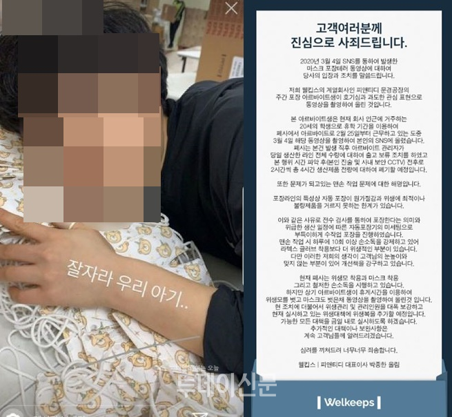 【투데이신문 김효인 기자】 마스크공장 아르바이트생이 비위생적인 행위를 SNS계정에 공개해 논란이 된 가운데, 해당 마스크 제조·판매 업체인 웰킵스가 이를 사과하고 당시 생산량을 전량 폐기하기로 했다.