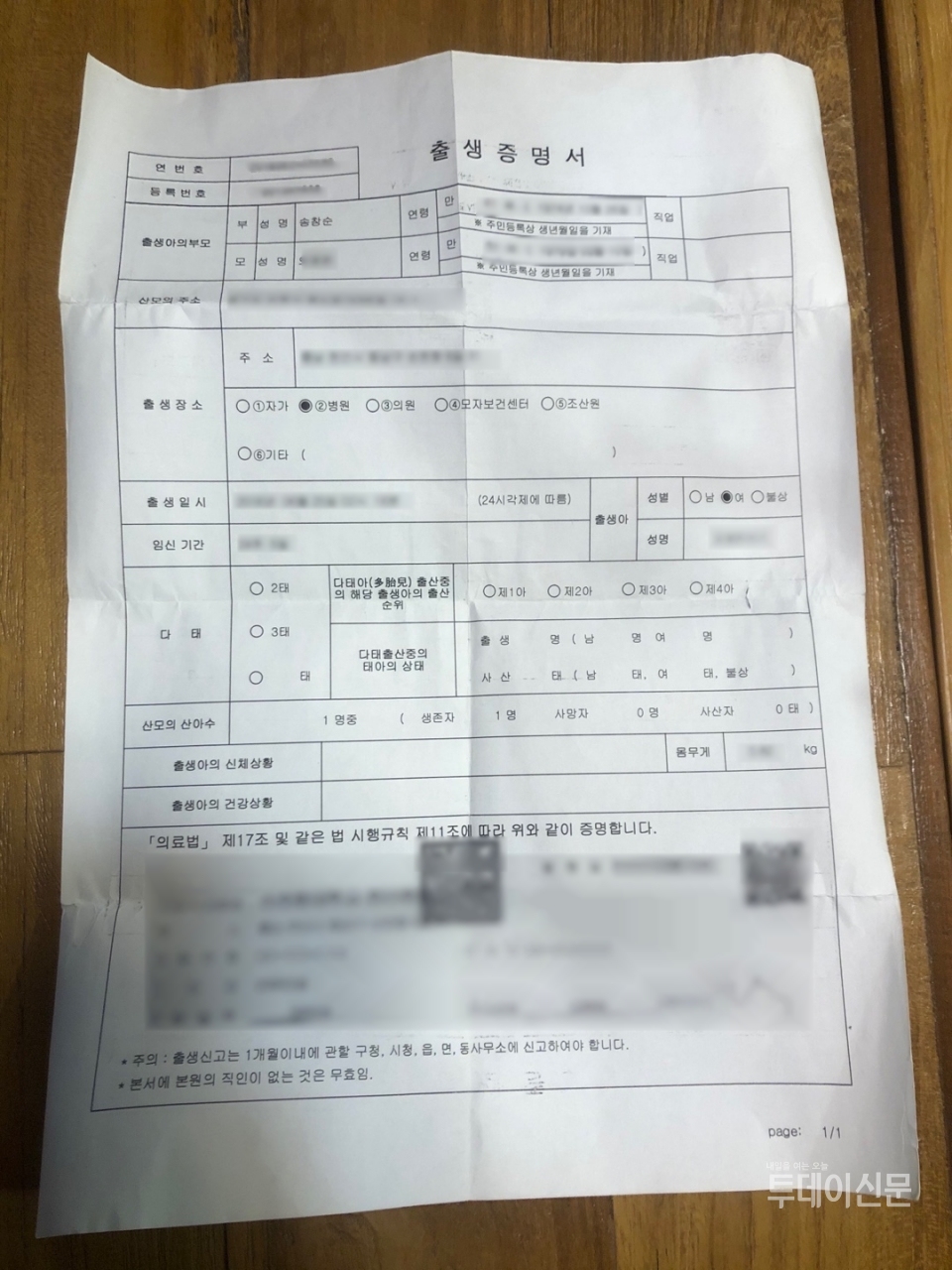 아이의 엄마는 송씨를 만날 당시 전 남편과 서류상으로 이혼을 하지 않은 상태였고, 수애 출생신고는 할 수 없었다. 지금도 마찬가지지만 당시 현행법상 아빠 혼자 출생신고를 하기에는 제약이 많았다. 또 그때까지만 하더라도 아이 엄마와의 관계가 지금과 같이 흘러갈 거라곤 미처 생각하지 못했다. 수애의 출생신고는 차일피일 미뤄졌고, 아이의 존재를 부정하는 것만 같아 송씨는 딸에게 미안한 마음뿐이었다. 그리고 어느덧 수애는 네 살이 됐다.