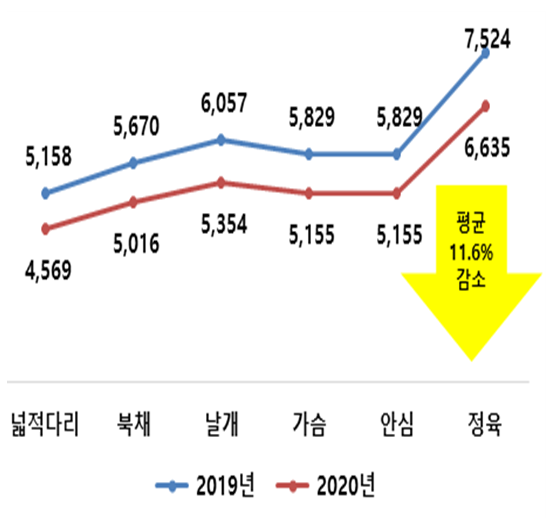 실제로 센터가 지난해 대비 올해 닭고기 부위별 가격을 살펴본 결과 넓적다리, 날개, 가슴, 안심 등 6가지 부위의 가격이 모두 하락했다. 넓적다리는 5158원에서 4569원으로 11.4% 감소했고, 정육은 7524원에서 6635원으로 가장 큰 폭(11.8%)으로 하락해 평균 11.6% 인하됐다는 설명이다.