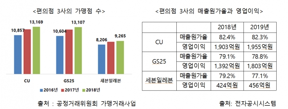 아울러 센터는 편의점 본사의 재무 상태가 양호한 상황이기에 가격 인상이 시급한 상황도 아니라고 지적했다. 실제로 지난 2016년 대비 2018년 편의점 가맹점 증가수를 살펴보면, GS25는 1만604개에서 1만3107개로 가장 높은 증가율인 23.6%를 보였으며 CU는 1만857개에서 1만3169개로 늘어나 21.3% 증가했다. 세븐일레븐도 8206개에서 9265개로 12.9% 늘었다.