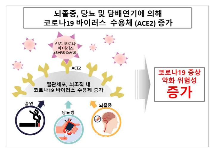 국립보건연구원 고영호 박사팀(최지영 박사, 이혜경 박사, 박정현 박사(공동 제1저자))은 코로나19로 인한 중증 질환 위험 요인인 뇌졸중, 담배연기 및 당뇨에 노출된 혈관 및 뇌 성상세포와 뇌 조직에서 나타난 변화를 분석한 결과 코로나19 바이러스 수용체 역할을 하는 ACE2 발현이 증가하는 것을 확인했다.