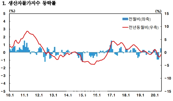 【투데이신문 김효인 기자】 코로나바이러스감염증-19(이하 코로나19)로 인해 내리 하락세를 보이던 생산자물가지수가 5개월 만에 반등했다. 이는 국제유가가 상승해 휘발유 등 공산품의 물가가 오른 영향이다.