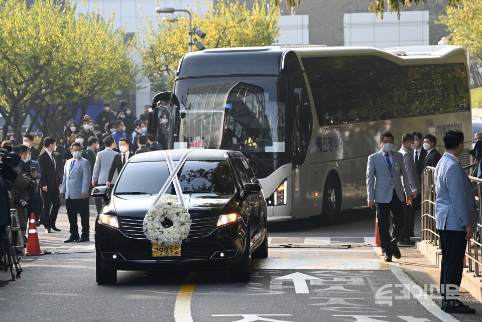 영결식을 마치고 장례식장에서 운구차가 출발했고 유족용 버스 등 운구 행렬이 뒤를 따랐다.