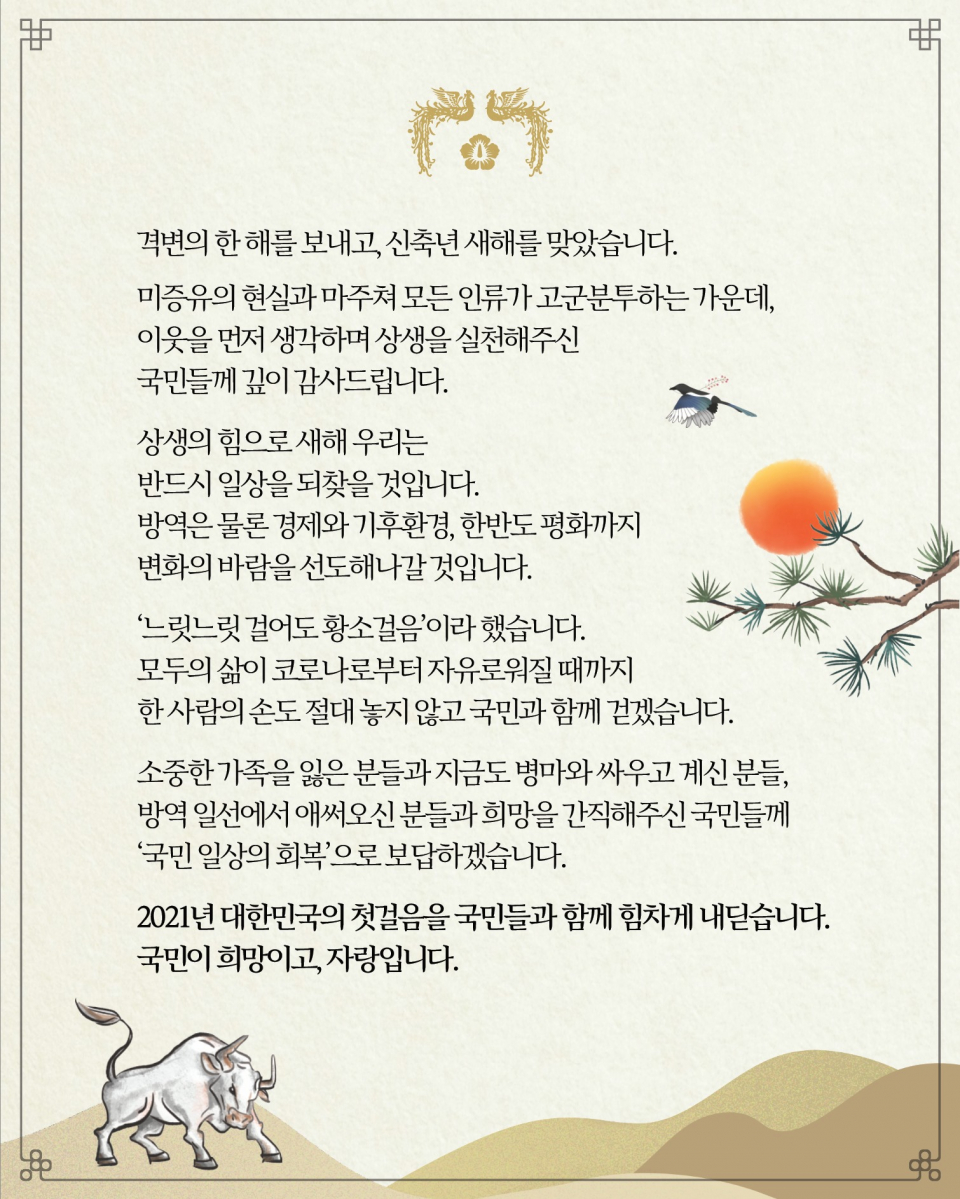 앞서 문 대통령은 이날 오전 트위터·페이스북 등을 통해 “격변의 한 해를 보내고, 신축년 새해를 맞았다”며 “미증유의 현실과 마주쳐 모든 인류가 고군분투하는 가운데, 이웃을 먼저 생각하며 상생을 실천해주신 국민들께 깊이 감사드린다”며 밝혔다.