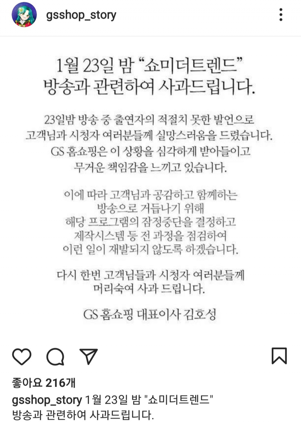 전날 GS홈쇼핑은 자사 홈페이지를 비롯한 공식 인스타그램, 애플리케이션 등에 23일 밤 ‘쇼미더트렌드’ 방송과 관련한 공식 사과문을 게재했다. 해당 입장문에는 출연자의 적절치 못한 발언에 대한 사과가 담겼다. 아울러 해당 프로그램을 잠정적으로 중단하고 제작 및 방송 전 과정에 대한 점검에 착수하기로 했다는 내용이 포함됐다.
