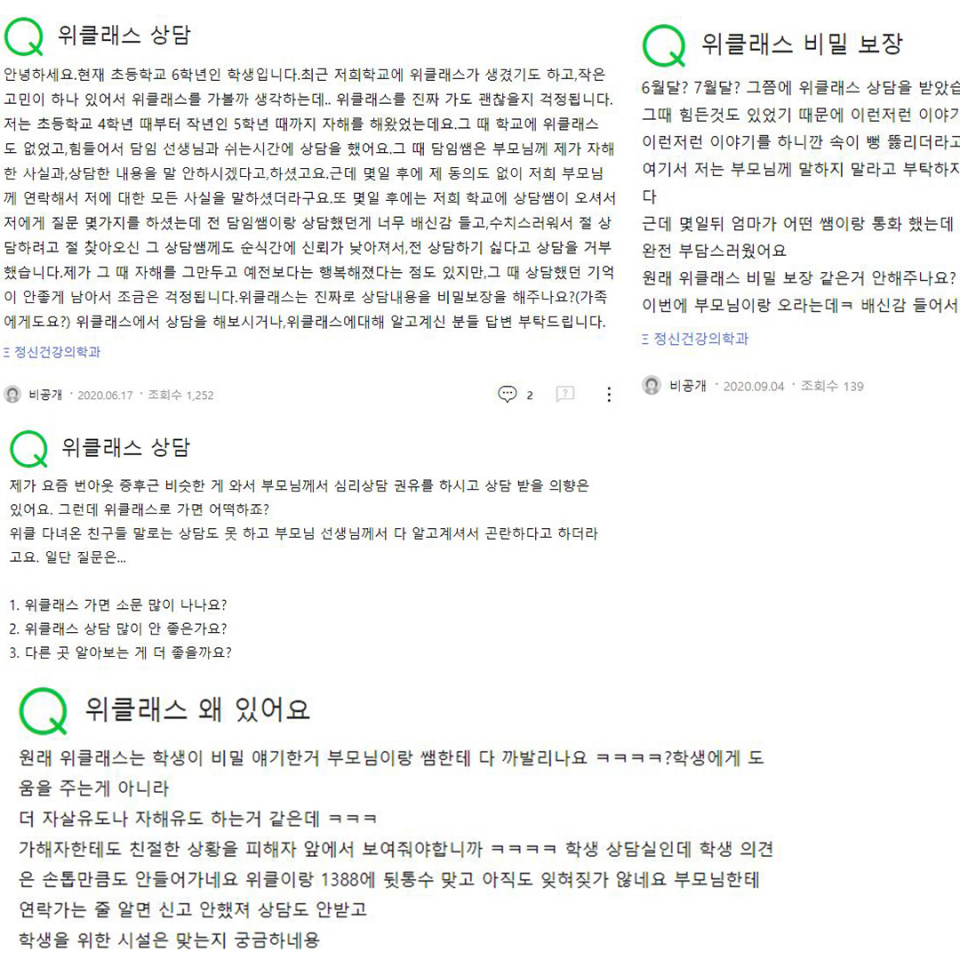 네이버 지식 IN에선 위 클래스 상담 이후 오히려 상황이 악화됐다고 호소하는 청소년들을 쉽게 찾아볼 수 있었다. 네이버 지식IN에 위 클래스라는 단어를 검색해보면 위클래스에 대한 불만 섞인 글들이 다수 발견됐다. 특히 위 클래스의 허술한 비밀보장에 대한 우려와 상담 내용이 부모님에게 알려져 난감하게 됐다는 내용이 주를 이룬다.