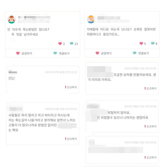 청소년들의 자살을 막기 위해 만들어진 상담서비스에서 자살유발정보가 공공연하게 유통되고 있는 실정인 것이다. 해당 게시글들은 ‘자살예방 및 생명존중문화 조성을 위한 법률‘에 근거했을 때 분명한 단속 대상임에도 불구하고 손쉽게 찾아볼 수 있었다.