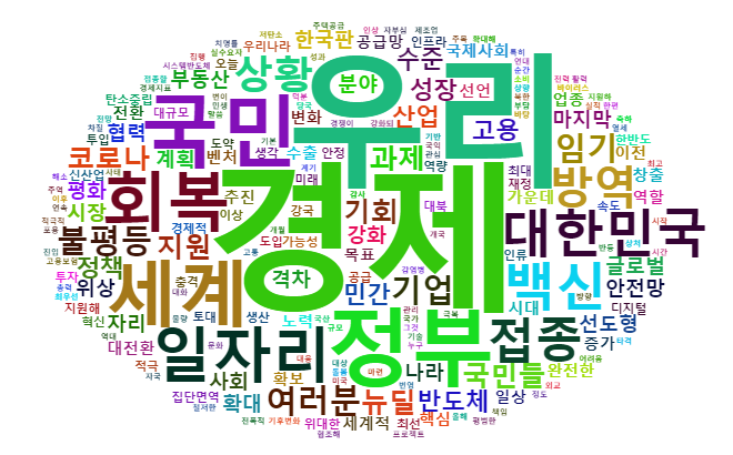 1403개의 단어를 사용한 이번 연설에서 ‘경제’(40회) 다음으로 사용이 많았던 단어는 우리(36회), 정부(21회), 국민(20회), 세계(18회), 회복(16회), 일자리(15회), 대한민국(13회), 백신(13회), 접종(12회), 방역(11회) 등이었다.