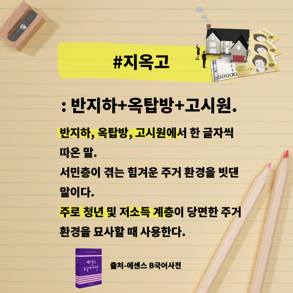 서민층이 겪는 힘겨운 주거 환경을 빗댄 말이다. 주로 청년 및 저소득 계층이 당면한 주거 환경을 묘사할 때 사용한다.